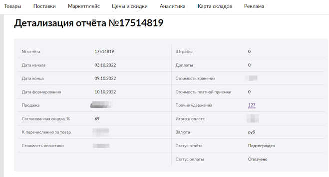 Если сумма оплаты становится отрицательной, к примеру, из-за задолженности за логистические услуги без выручки, то эту сумму МП удержит из прибыли в следующий период. И тогда в колонке «Статус оплаты» появится запись «Учтено в удержании».